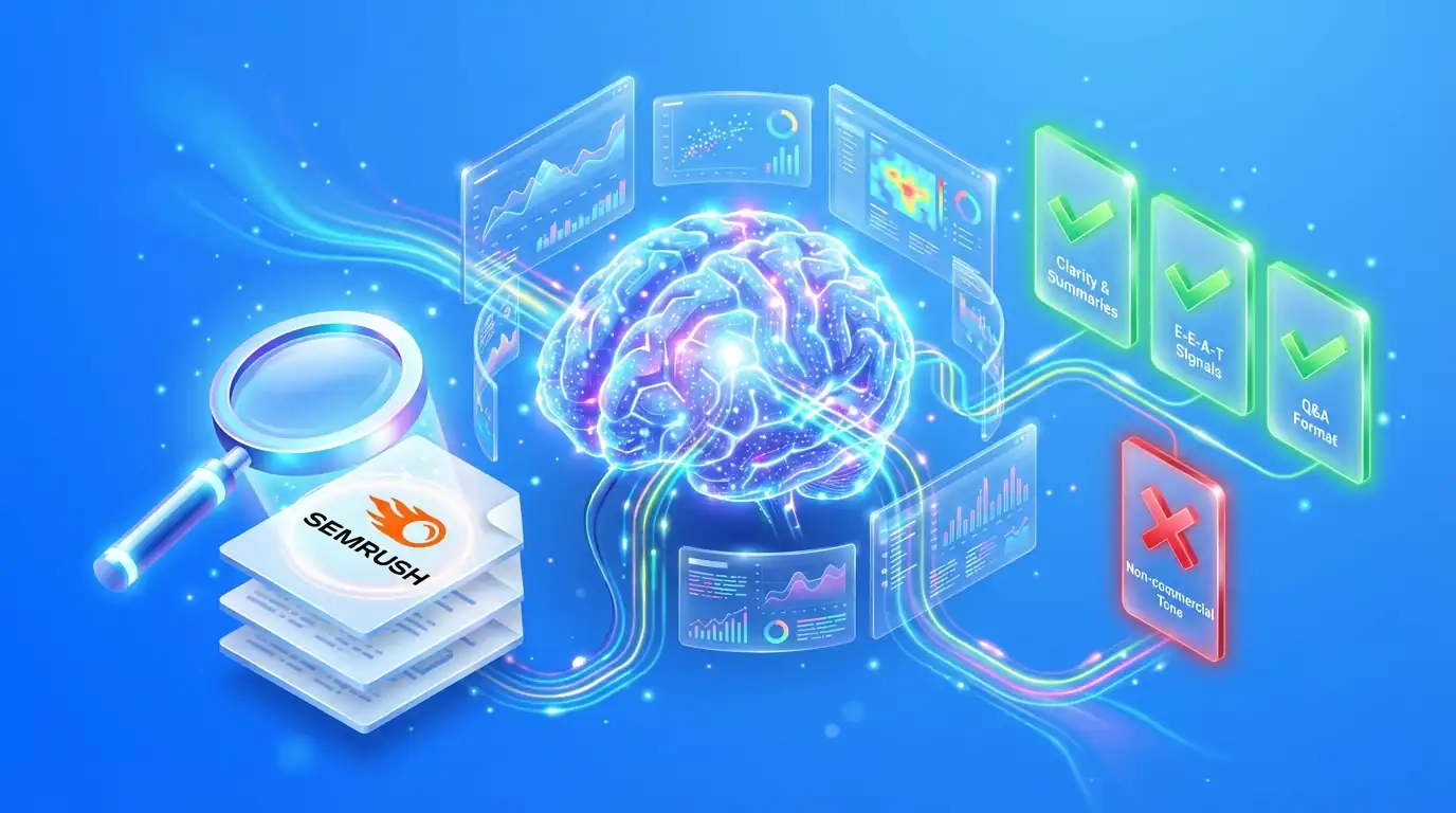Semrush przeanalizował ponad 300 000 URL cytowanych przez AI i porównał je z wynikami Google, aby zidentyfikować cechy contentu najsilniej korelujące z cytowaniami w wyszukiwarkach AI.