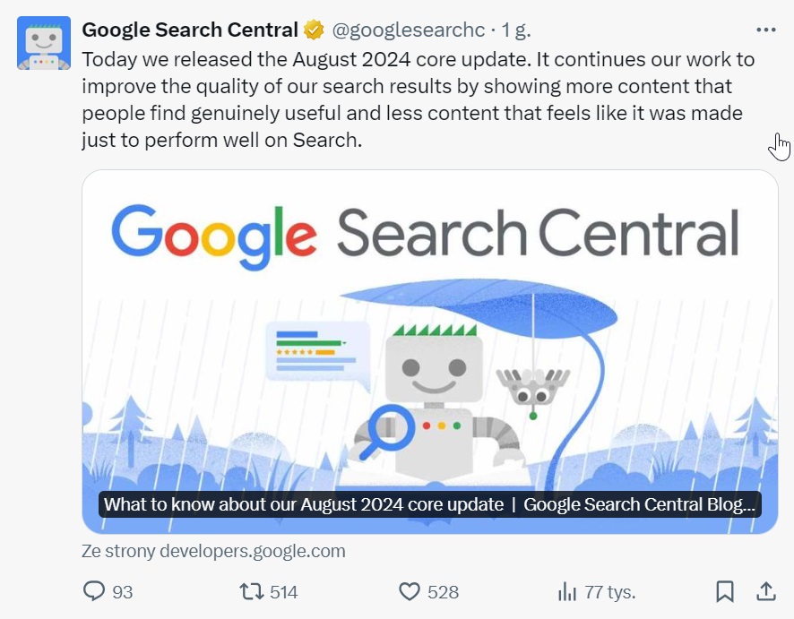 Innym wyróżnikiem Core Update Sierpień 2024 jest fakt, że to aktualizacja niezwykle wyczekiwana. Od kilku tygodni przedstawiciele Google’a sugerowali w social mediach, że wkrótce się pojawi i będzie stanowiła odpowiedź na szeroko zakrojone słowa krytyki ze strony mniejszych wydawców. Sugerowali oni, że Google celowo odcina ich od użytkowniczek i użytkowników niezależnie od jakości publikowanego przez nich contentu.