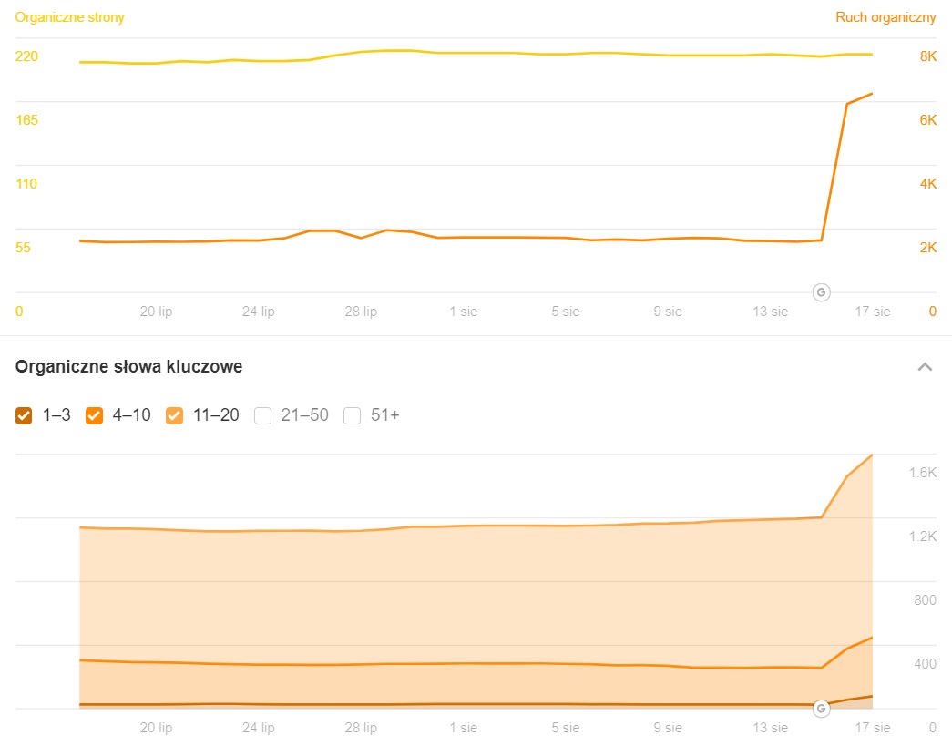 Sprawdziłem więc wyniki w TOP3 i TOP10 dla 50 domen z 6 różnych kategorii dla dwóch dat: 6 sierpnia oraz 6 września. Co ciekawego zaobserwowałem?