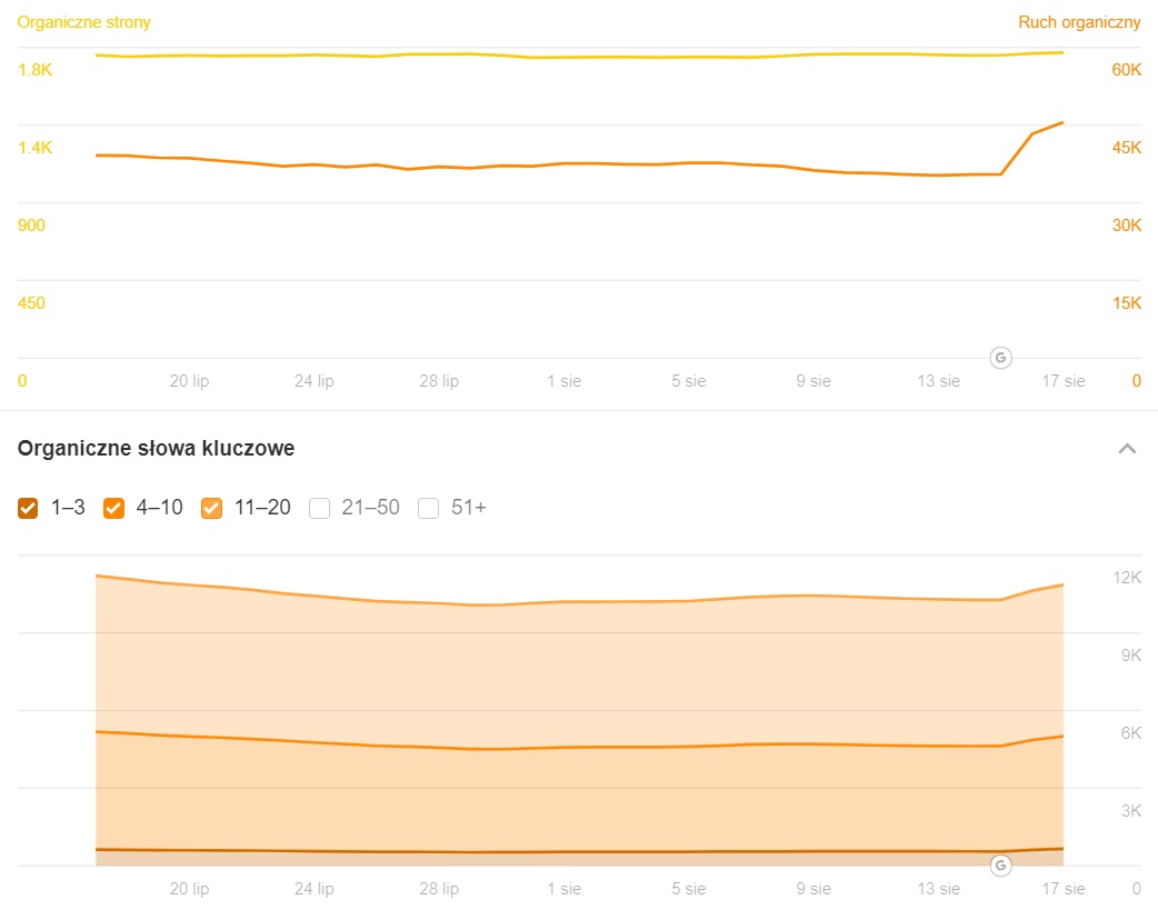 Natomiast spośród trzynastu stron poniżej 10k keywordów w tym zakresie tylko trzy były na minusie, z czego tylko jedna zaliczyła poważniejsze spadki.