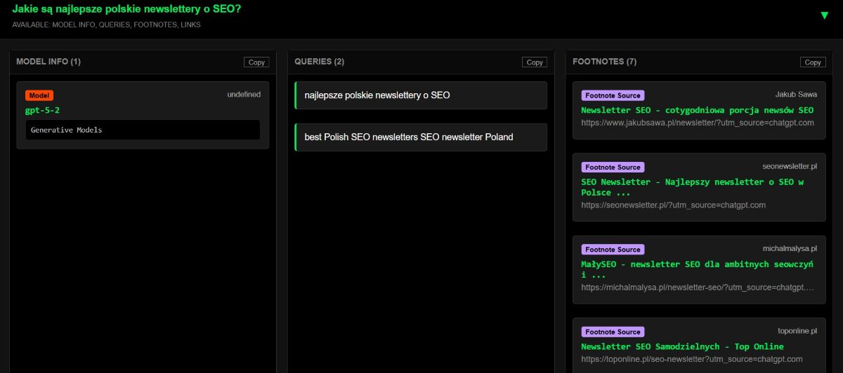 Chociaż ogółem danych jest mniej niż we wcześniejszym bookmarklecie, i tutaj mamy do czynienia z bardzo poręcznym skryptem. Chociaż z wniosków z badań fan-out queries w AI Overviews wynikało, że poprawną drogą jest raczej zapewnienie kompleksowego pokrycia tematycznego, niż odpowiadanie na pojedyncze zapytania rozgałęzione, analiza danych wyciągniętych tymi zakładkami będzie całkiem niezłym dodatkiem do dowolnego researchu słów kluczowych, zagadnień oraz tematów.