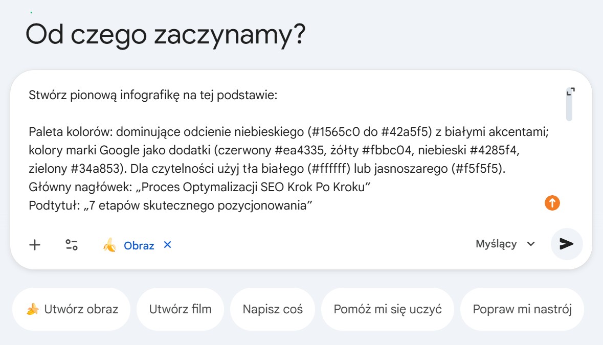 W celu zapewnienia względnie dobrego porównania możliwości różnych systemów, korzystałem z dość podobnych promptów, mających na celu stworzenie bardzo podstawowych infografik dla dwóch wiodących podstron z bloga MałySEO. Treść pod infografikę nr 1 została przetworzona wcześniej, natomiast w przypadku nr 2 wrzucałem cały fragment tekstu. Paleta kolorów określona jest na podstawie prompta, z którego korzystam do tworzenia cover photos. Trzecia, bonusowa infografika, dotyczy wyłącznie LLM-ów i zainspirowana została ogłoszeniem z bloga Google dotyczącym obecnych możliwości Nano Banana Pro.