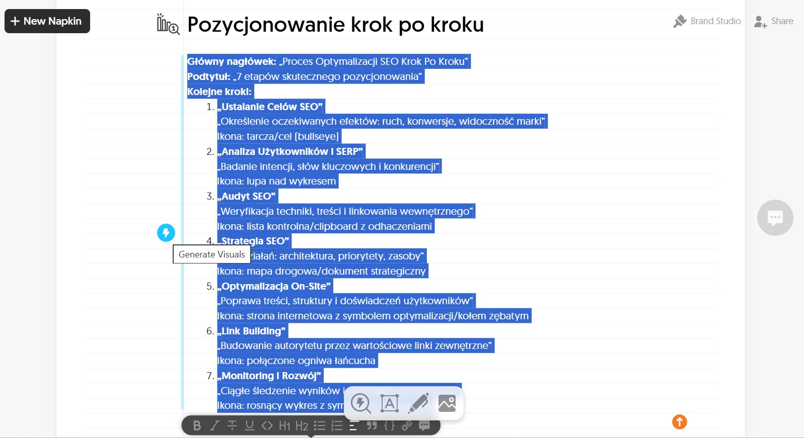 4. Wklej treść, którą chcesz umieścić na infografice, zaznacz całość po czym kliknij ikonkę błyskawicy (Generate Visuals).