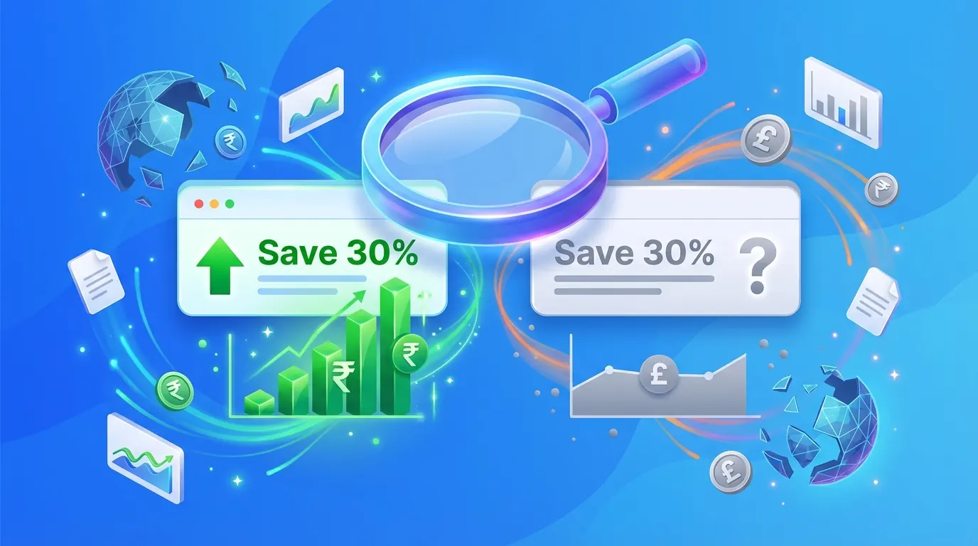 SearchPilot przeprowadził kontrolowany test A/B SEO, w którym zbadał wpływ dodania komunikatu promocyjnego „Save 30%” do meta descriptions na stronach wyników wyszukiwania lotów — osobno dla rynku indyjskiego (IN) i brytyjskiego (UK).